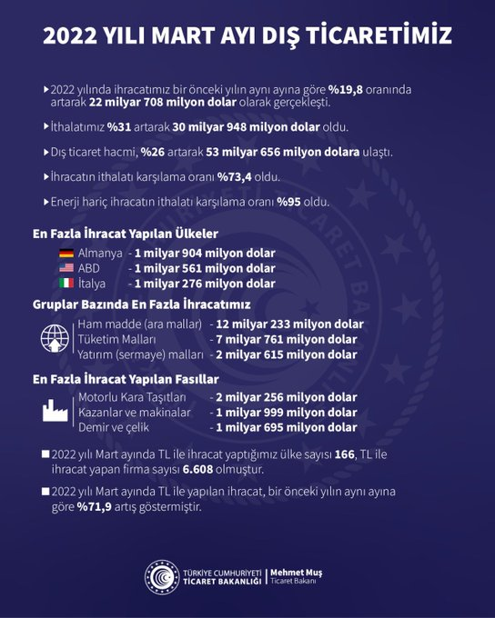 2022 yılı Mart ayında geçen yılın aynı ayına göre; ihracat %19,8 oranında artışla 22 milyar 708 milyon dolar, ithalat %31,0 oranında artışla 30 milyar 948 milyon dolar oldu. 2022 yılı Ocak-Mart döneminde ise, ihracat %20,8 oranında artışla 60 milyar 288 milyon dolar, ithalat %42,1 oranında artışla 86 milyar 681 milyon dolar olarak gerçekleşti.