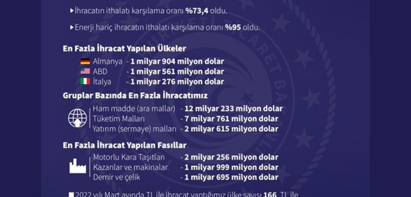 2022 yılı Mart ayında geçen yılın aynı ayına göre; ihracat %19,8 oranında artışla 22 milyar 708 milyon dolar, ithalat %31,0 oranında artışla 30 milyar 948 milyon dolar oldu. 2022 yılı Ocak-Mart döneminde ise, ihracat %20,8 oranında artışla 60 milyar 288 milyon dolar, ithalat %42,1 oranında artışla 86 milyar 681 milyon dolar olarak gerçekleşti.
