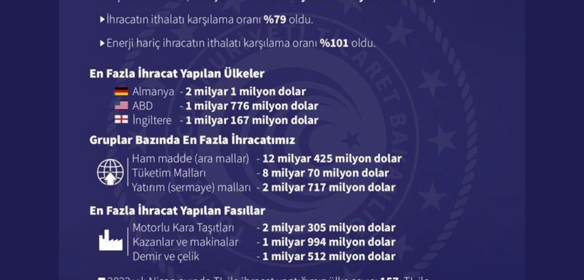 2022 yılı Nisan ayında geçen yılın aynı ayına göre; ihracat %24,6 oranında artışla 23 milyar 364 milyon dolar, ithalat %34,9 oranında artışla 29 milyar 466 milyon dolar oldu. 2022 yılı Ocak-Nisan döneminde ise geçen yılın aynı dönemine göre, ihracat %21,7 oranında artışla 83 milyar 565 milyon dolar, ithalat %40,1 oranında artışla 116 milyar 73 milyon dolar olarak gerçekleşti.